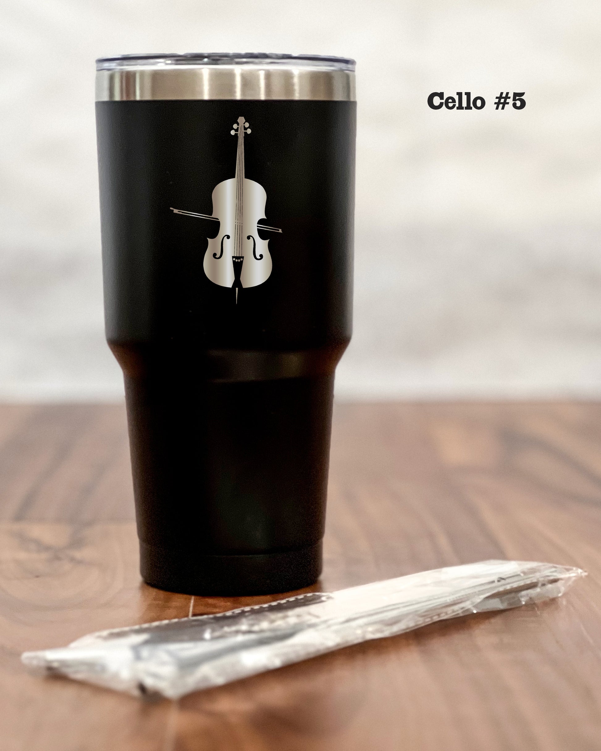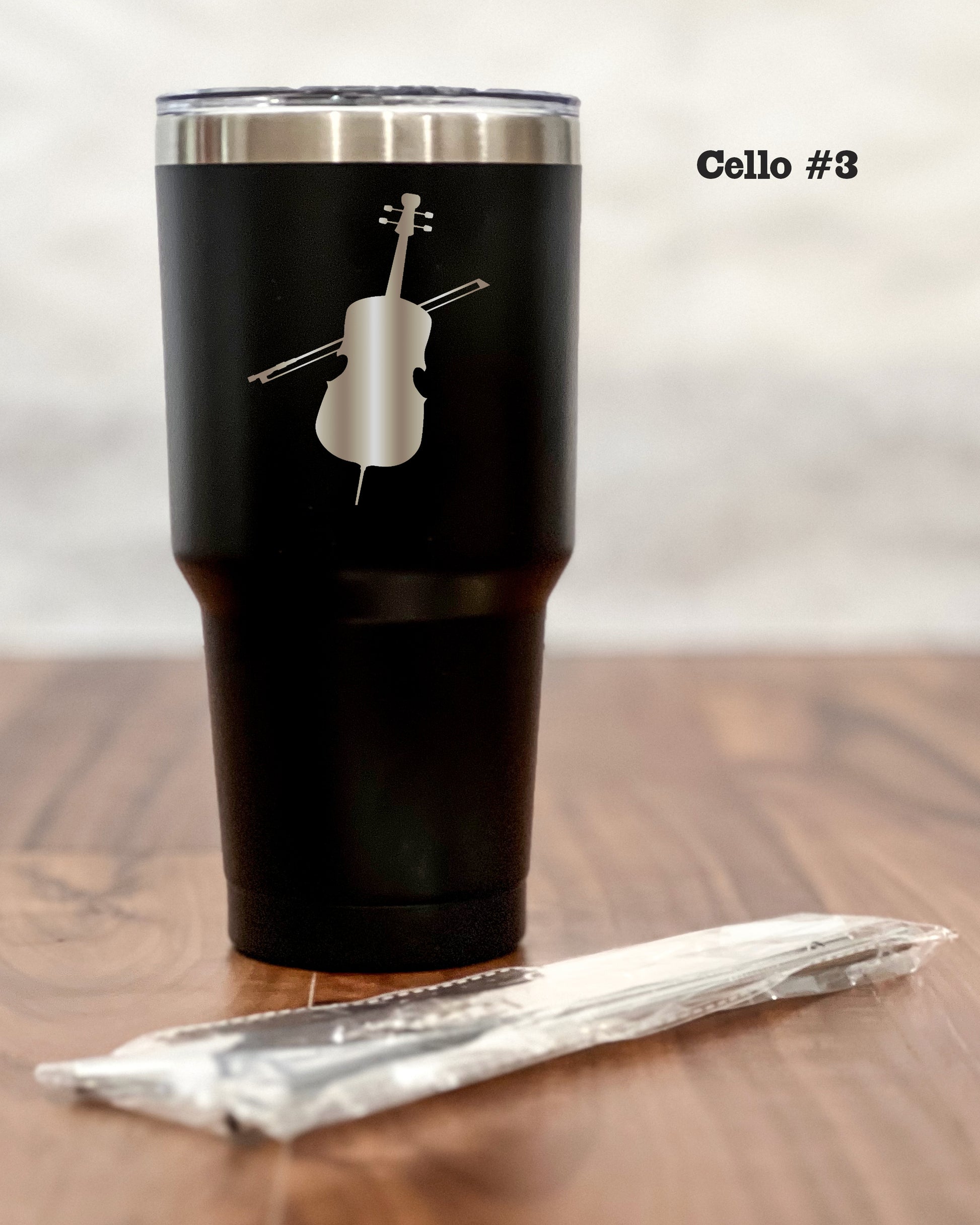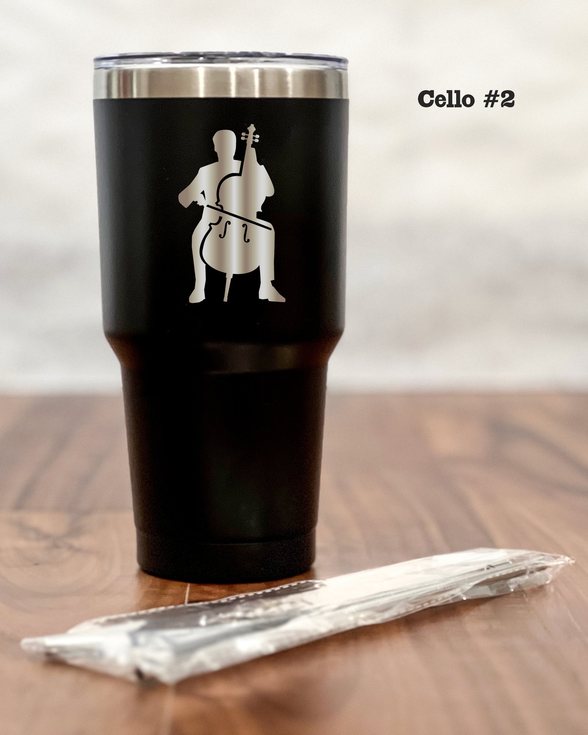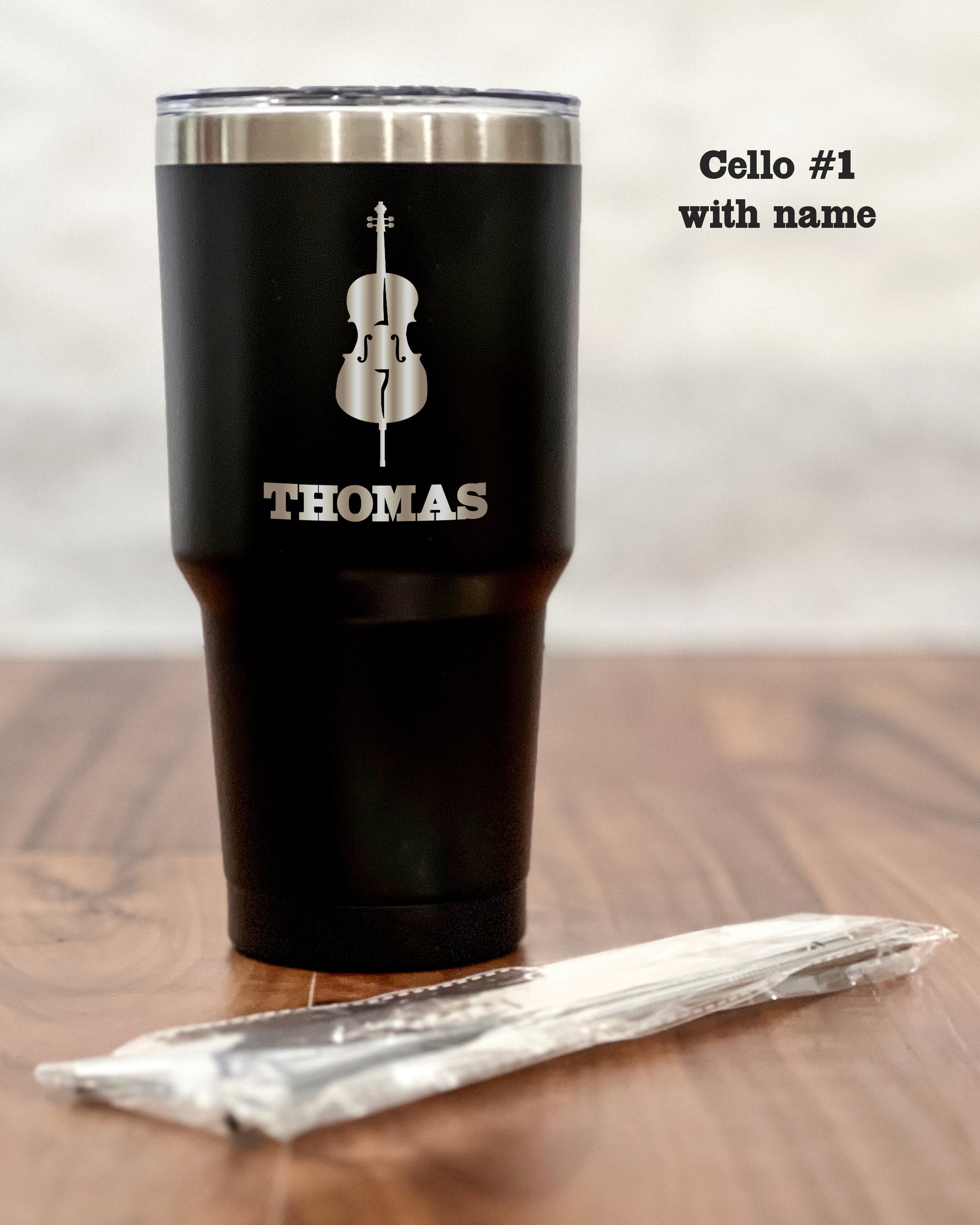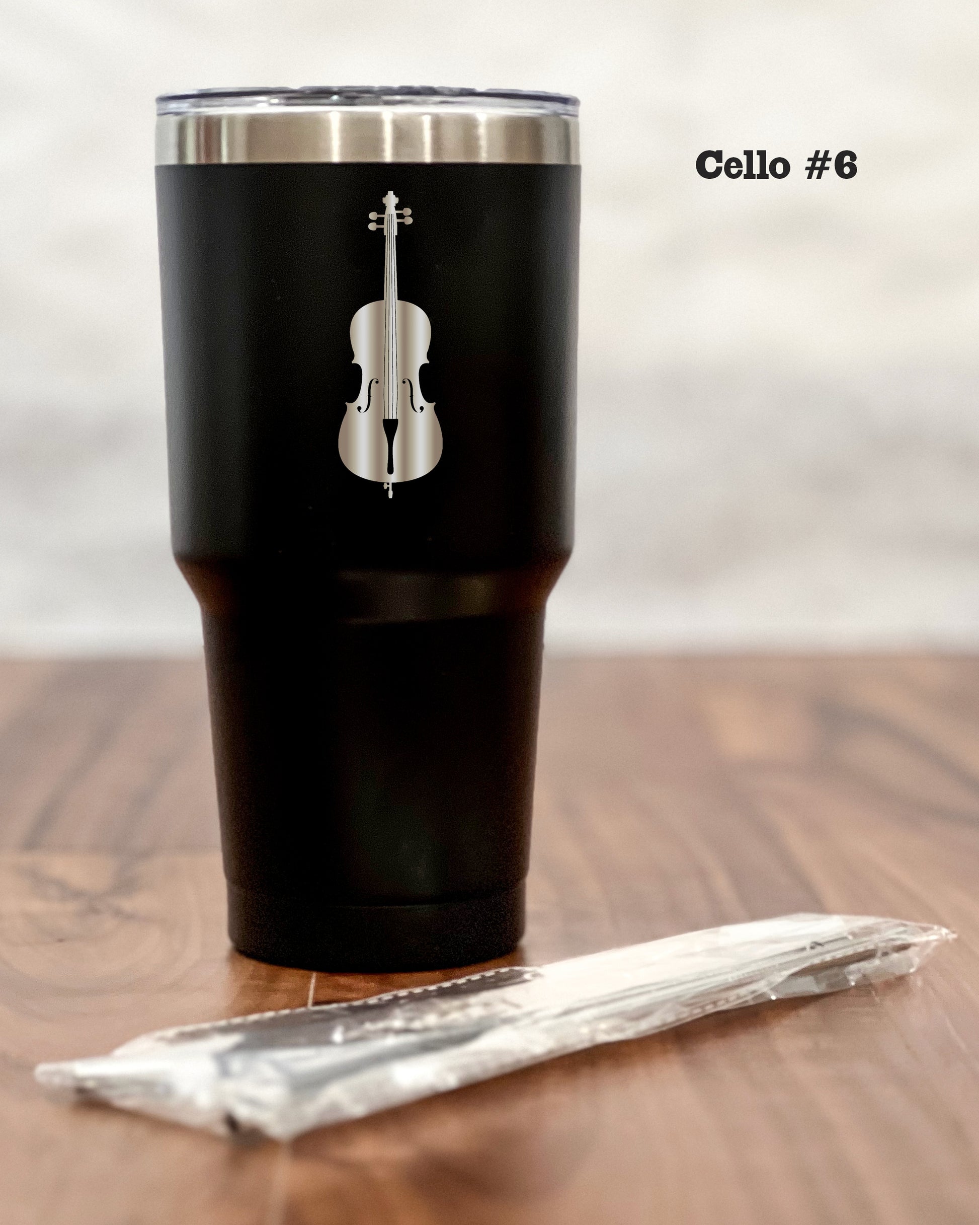 Crafted from premium stainless steel, the sleek black exterior exudes sophistication and modernity, making it the perfect companion for any occasion – be it your morning commute, an outdoor adventure, or simply lounging at home. But what truly sets the tumbler apart is its laser-engraved silhouette of a Cello – a symbol of harmony, passion, and the timeless beauty of music. This artful detailing adds an air of refinement to your tumbler, making it a statement piece that reflects your unique personality.